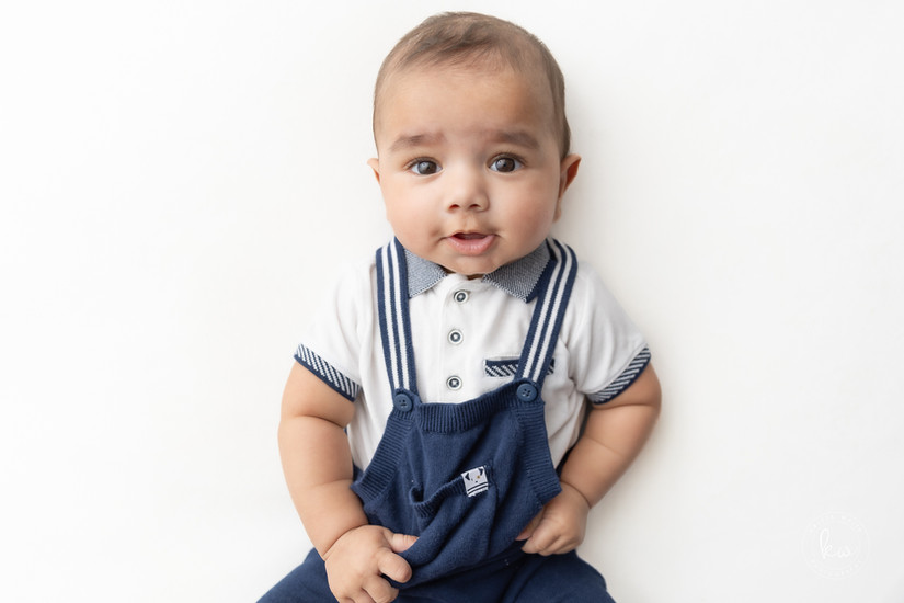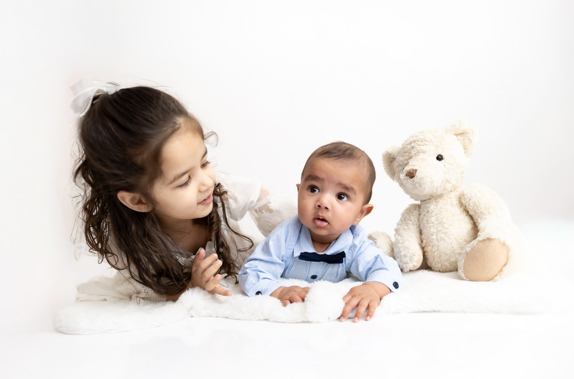 For this milestone session, we leaned into a "pure and simple" aesthetic. Using a crisp white backdrop and soft, plush textures, we kept the focus exactly where it belongs: on the sweet connection between siblings and those curious six-month-old eyes.